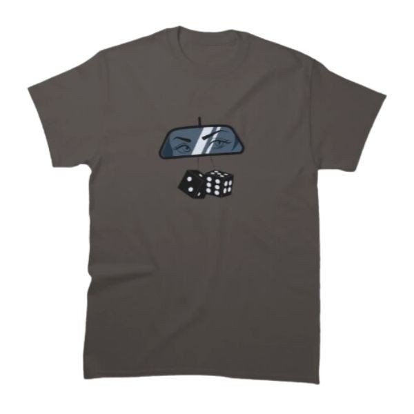 • Front print featuring a detailed illustration of a dipping rearview mirror with fuzzy dice.