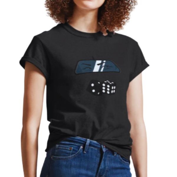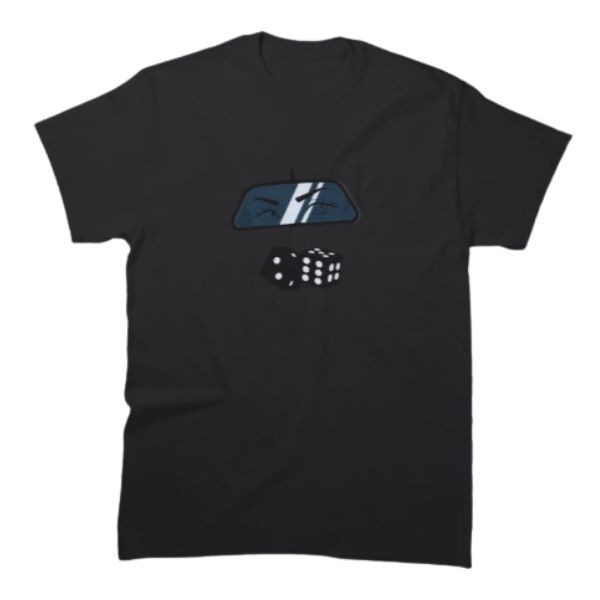 • Front print featuring a detailed illustration of a dipping rearview mirror with fuzzy dice.