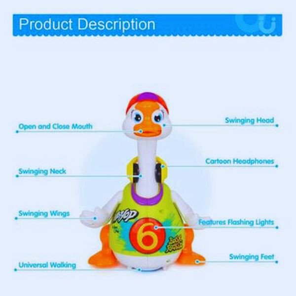 The HOLA 828 Hip Hop Dancing Walking Swing Goose Musical Educational Toy is a fun and interactive toy designed for young children. This vibrant goose toy dances, swings, and walks, providing hours of entertainment while also encouraging physical activity, coordination, and creativity. With its hip hop music and lively movements, the toy is designed to engage kids in dancing along, improving their motor skills. The HOLA 828 is also educational, introducing children to rhythm, music, and movement in a playful manner. Its interactive features, like flashing lights and various sound effects, further enhance sensory development.