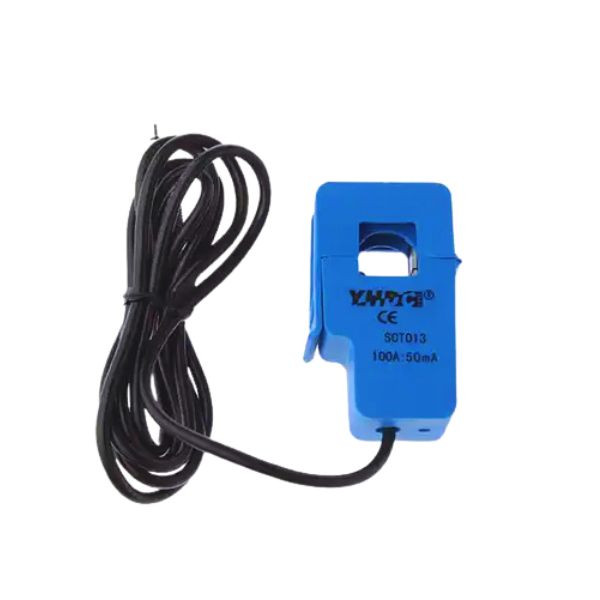 The SCT-013-000 is a non-invasive, split-core current transformer (CT) designed for measuring alternating current (AC) in electrical systems. It is widely used in energy monitoring, IoT applications, and power management systems. The split-core design allows for easy installation without the need to disconnect the wire being measured, making it ideal for retrofitting into existing systems. The sensor is capable of measuring currents up to 100A and outputs a proportional AC voltage signal, which can be interfaced with microcontrollers, data loggers, or other monitoring devices.