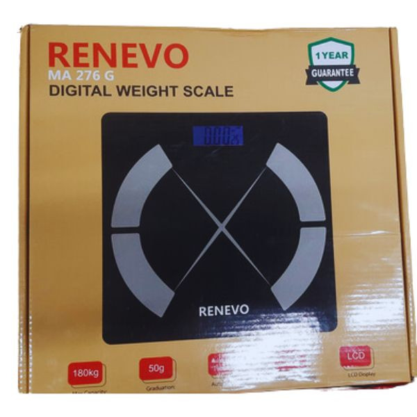 The Renevo Digital Weight Scale MA 276 is a sleek, modern weighing scale designed for home and personal use. Its minimalist black design makes it a stylish addition to any bathroom or bedroom. Equipped with an easy-to-read LCD display, this scale delivers accurate weight measurements for users who prioritize functionality and reliability. Perfect for monitoring fitness goals, maintaining a healthy lifestyle, or simply tracking daily weight changes.