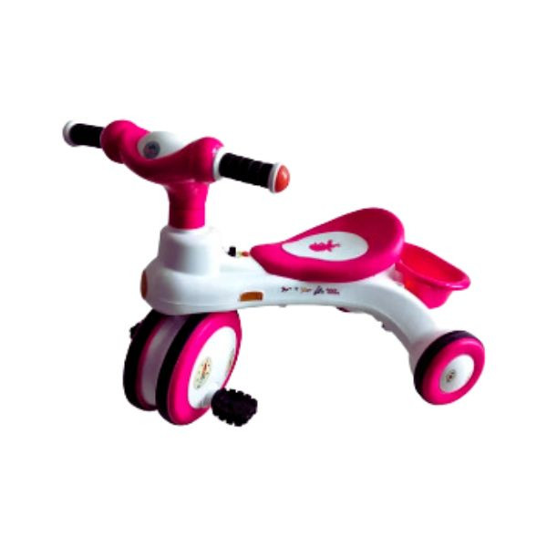 The RFL Rock Rider WO 881391 Backrest-3Y Plus-Pink is a tricycle designed for children aged 9 months to 5 years. It features a comfortable seat with a backrest, a push handle for easy maneuvering, foot support, and a music and lighting system with adjustable volume. The tricycle is made from virgin polypropylene material, ensuring safety, strength, and durability. Its dimensions are 67 cm in length, 41 cm in width, and 48.5 cm in height. The tricycle is eco-friendly and available in various colors and sizes.