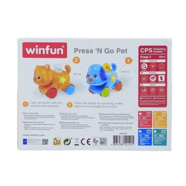 The Winfun Press'N Go Pet Puppy is an interactive, engaging toy designed to entertain and aid in the development of young children. With its friendly, colorful design and simple mechanics, this push-and-go puppy toy is perfect for toddlers who are just learning how to crawl or walk. Children can press down on the puppy’s back to watch it zoom forward, encouraging them to move along and develop their motor skills, hand-eye coordination, and balance.