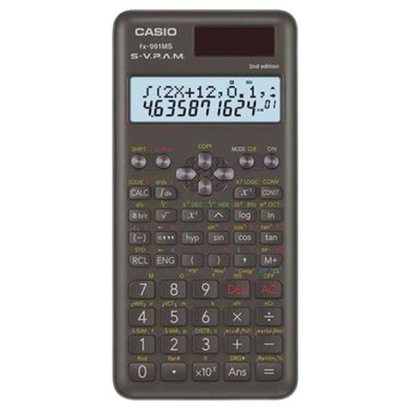 The Casio Scientific Calculator FX-991MS-2 is a reliable and advanced tool for students, engineers, and professionals needing precise calculations. This 2nd edition builds on Casio's legacy of accuracy and user-friendly design, now with a sleeker, ergonomic body and updated technology. The calculator features a 2-line display, allowing users to view both input and results simultaneously, which enhances usability for complex calculations. Equipped with 401 functions, including scientific, statistical, and advanced mathematical operations, the FX-991MS-2 handles everything from basic arithmetic to calculus, trigonometry, and regression analysis. Its solar-powered operation with battery backup ensures continuous use without interruptions. With a lightweight and durable design, it’s perfect for on-the-go calculations.