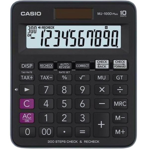 The Casio MJ-100DPLUS-W-DP-W is a versatile and efficient desktop calculator designed for business and personal use. It features a user-friendly interface with advanced functions for accurate calculations, ensuring reliability and convenience for daily tasks. The calculator includes "Check & Recheck" functionality for reviewing and correcting entries, making it ideal for financial and data-heavy operations. Its durable design and large display enhance usability, while additional features like tax calculations, percentage keys, and memory functions offer added utility.