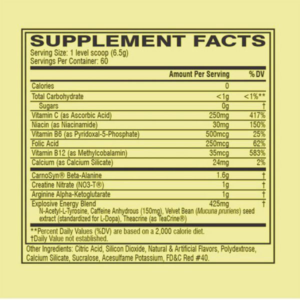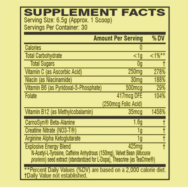 Dosage & Usage: Mix 1 scoop (6-8 g) with 6-8 oz of water, 20-30 minutes before exercise.