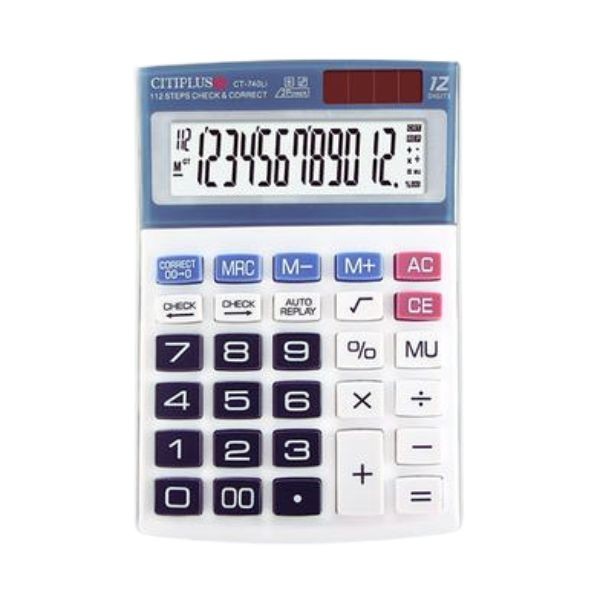 The Citiplus CT-740LI is a 12-digit electronic desktop calculator designed for both professional and educational purposes. It features an LCD display for easy readability and supports basic arithmetic functions along with advanced capabilities, including a 112-step check function. This model is solar-powered, ensuring energy efficiency, while also equipped with battery backup.