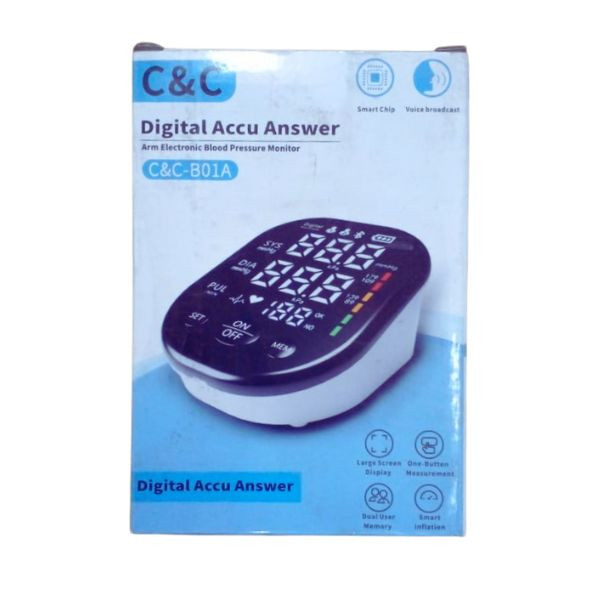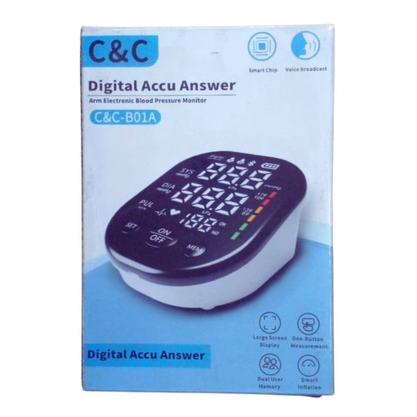 The Accu Answer Digital Blood Pressure Machine is designed to provide accurate and user-friendly blood pressure monitoring. While specific details about the C&C B01A model are limited, similar models offer the following features: