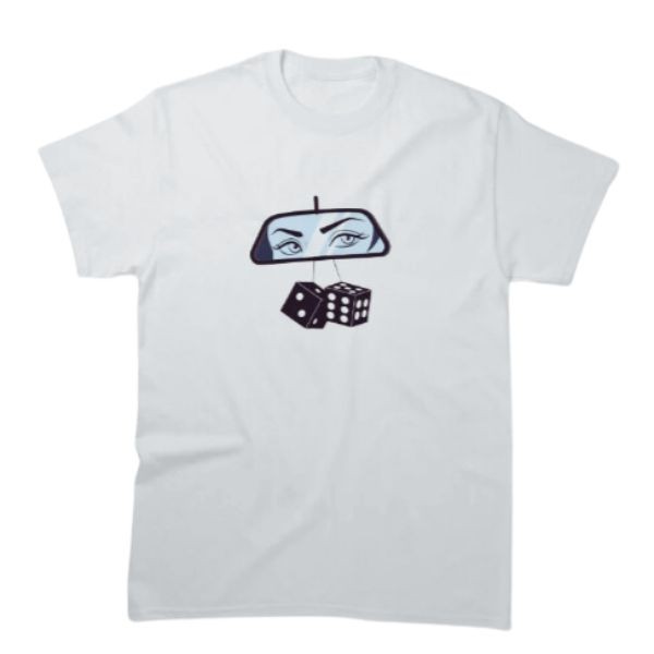 • Front print featuring a detailed illustration of a dipping rearview mirror with fuzzy dice.