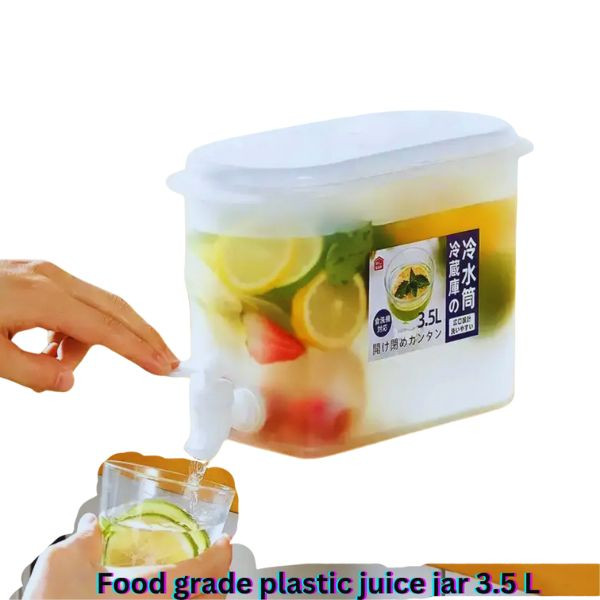 The High-Quality Food Grade Plastic Juice Jar (3.5L) is a durable and safe storage solution for beverages. Made from BPA-free, food-grade plastic, it ensures the purity and freshness of juices, water, and other drinks. The jar features a secure, airtight lid to prevent spills and maintain hygiene. Its ergonomic handle and lightweight design make it easy to pour and carry, making it ideal for home, office, and commercial use.