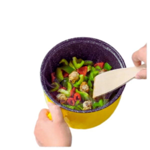 features a non-stick cooking pot for hassle-free food release and easy
